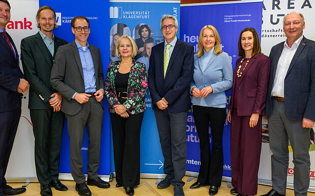 Foto von links: BKS-Vorstand Dietmar Böckmann, Jonas Claußen (Pädagogischer Leiter der Bildungsdirektion Kärnten), Georg Sitter, Uni-Rektorin Ada Pellert, Andreas Bollin, IV-Kärnten-Geschäftsführerin Claudia Mischensky, Gerhild Hubmann, Leiterin der Bildungsabteilung des Landes Kärnten, Martin Zandonella