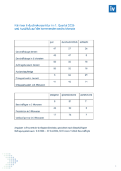 An der IV-Kärnten-Konjunkturumfrage für das erste Quartal 2026 haben 53 Unternehmen mit rund 15.900 Beschäftigten teilgenommen. Die Ergebnisse verdeutlichen, dass sich die Lage zwar etwas verbessert hat, von einer nachhaltigen Entspannung jedoch noch keine Rede sein kann.